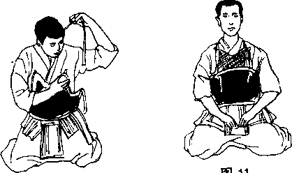 (2) 将胴甲的右胸带子绕过背身在胸部左穿带孔打一个结左胸带子绕过背身在右胸穿带孔打结(图10、图11)。