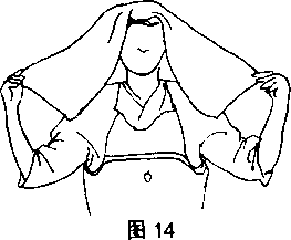 (1) 将头巾下端的中点对准头顶中心两边留同样长度两手抓住两个角(图14)