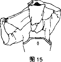(2) 将头巾的左端绕头部包一周(图15)