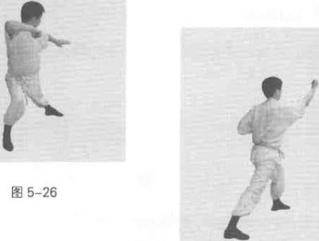 右脚进步同时左转身成右弓步右手屈肘左手向前方削掌(图5-26)