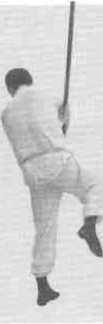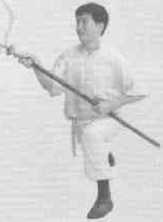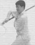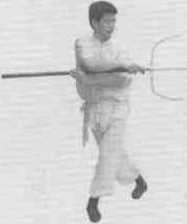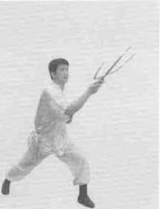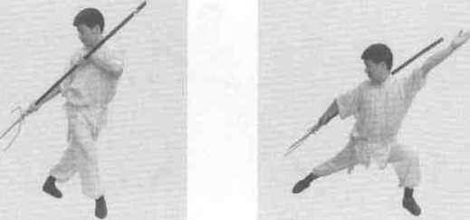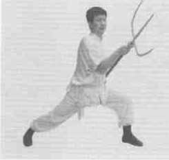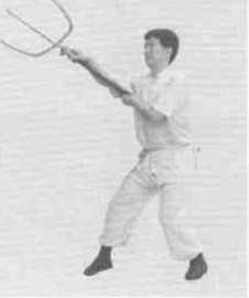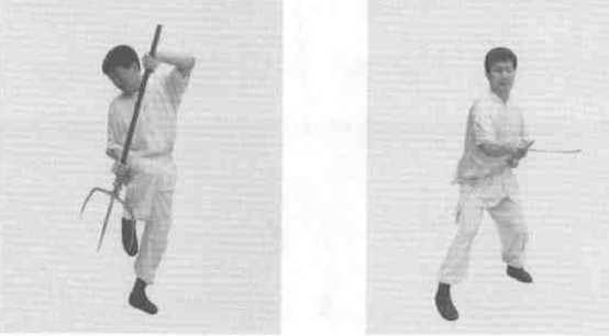 11左脚向右前方上步右脚跟着上步成右三战马步同时叉锋向左、向右斜前方挑击左手握叉把于右腋下(图7-27图7-28)