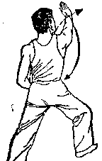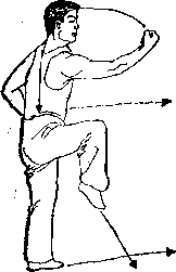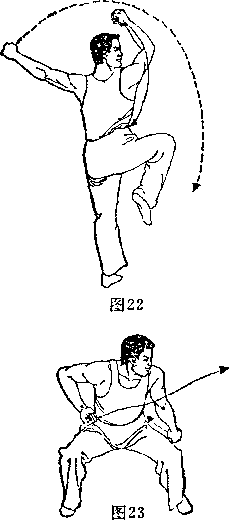 起身转向后方提右腿意即让开对方扫来的腿右掌变拳随之上撩意即击对方的颔面拳眼朝上(图30)。