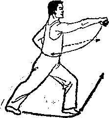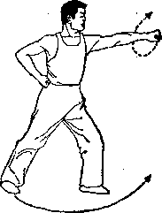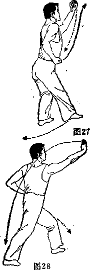 右脚贴地向前扫半圈至左脚前方,意在扫踢对方的腿,同时左拳内收后外拨由阴拳变为阳拳连消带打。左臂、右腿运动路线一致上下相应右拳不动(图27)