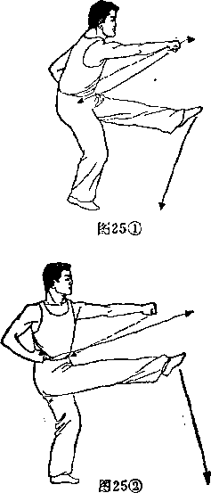 右拳收回以阳拳置于腰侧护腰。同时左拳向前冲拳右腿向前踢出。左膝微屈左腿坐实右腿踢出之高度略齐于腰足背绷紧以小趾侧向上挑踢击对方的下部眼视前方(图25之1)