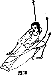 躯体极力下坐左腿右腿伸直成右仆步。转体向后同时右掌朝右下方猛砍以拨开对方自后袭来的腿眼光随之。凡仆步身宜尽量下蹲下腹抵大腿面仆腿要伸直脚尖里扣脚跟和足外侧缘不可翘起(图29)。