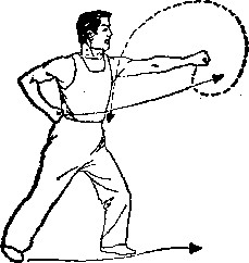 图26图26左脚落地成弓步。右拳收回护腰左拳顺左腿向前冲拳。与弓腿同侧之上肢顺方向出手称顺步。此式为顺步冲拳(图26)。