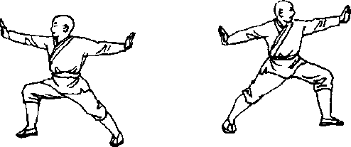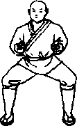 1 两足左右分开两腿屈膝成马步两手屈肘握拳抱于