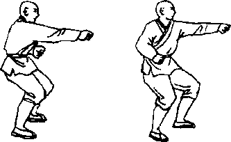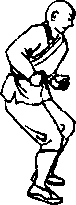 1 两足向两侧开立两腿屈膝半蹲成马步!两掌握拳屈肘抱于腰间两侧拳心斜向上目视前方(图57)