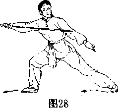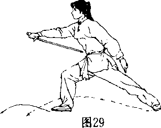 接前势向后观察后瞬间即将头向右扭转眼向前看手与剑式不变左脚先迈出步子大小不拘须自然适宜步数多少不限此式为佯败行走时虽不回头但全神关注着后面对方的信息口(图29)