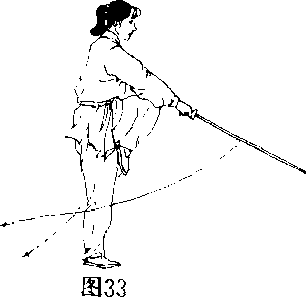 上势不停两臂分开后又迅速合拢右手剑向前下方截去左手心托住右手背身体直立起重心在右脚同时左脚抬起脚面绷紧脚心靠在右膝内上侧,成提膝独立步身体稍前探胸腹略内涵眼看剑身。(图33)