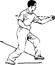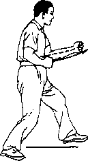 右脚略抬内扣落步身体左转90、左脚随转身朝北上步成双弓步,同时左拳随转身左平摆拳略同胸高拳心朝右右拳仍在腹前拳心朝左,眼视正北(图2—9)