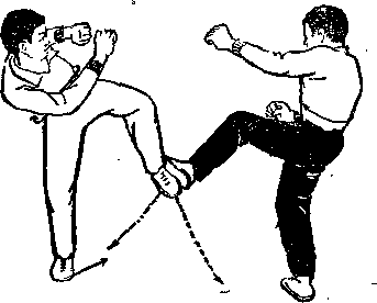 ()甲右腿前上步,左臂上架护于胸前口上体右倾重心落于右腿,左腿侧踹乙胸部右臂收回屈肘护于胸前乙右