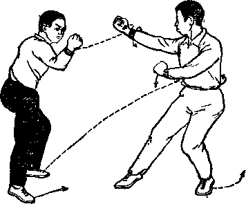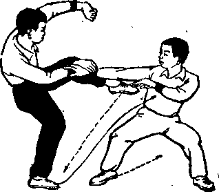 (2)乙右腿向前上半步上体右转右臂前伸右拳变爪抓甲右腕左拳向甲左太阳穴勾摆随之左腿弹踢甲腹部口甲左腿后撤半步两腿屈膝重心下沉成平马步,上体略左转两拳变掌左掌下按乙左脚背°(图-31)