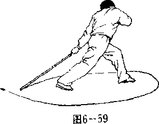 接上势右手持棍回拉左手于右手前握棍随即上牛右转右脚回挪左脚经右脚向前上步同时右手屈臂回抽左手随上步之势向棍把处滑握口目视左后方(图6—59)