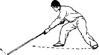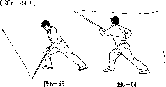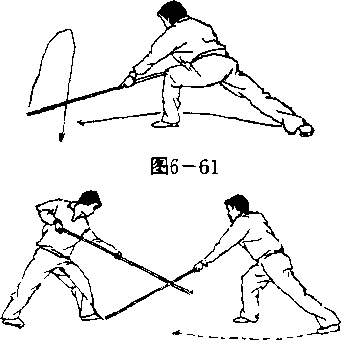 上动不停左脚上步成左弓步双手握棍随上步之势使棍把向前擦地戮出(图6-61)8