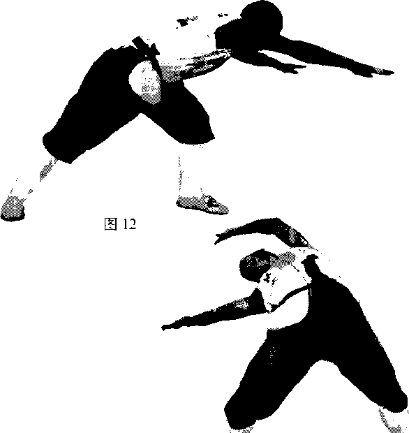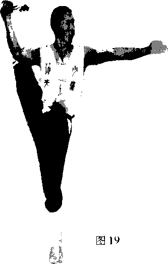 身体侧对支撑物站立左脚放在支撑物上脚尖勾起。右臂上举右掌侧于右胸前口两腿伸直立腰开战上体向左侧振压(图15)。练习时左右腿交替进行。