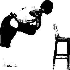 面对支撑物站立支撑物或石或木或椅等左脚跟放在支撑物上脚尖勾起两手扶按膝上两腿伸直立腰,收髓上体前屈并向前、向下做振压(图14)。练习时左右腿交替进行。
