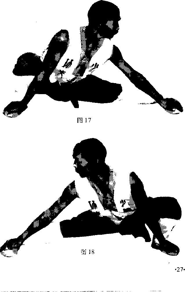 两脚开立右腿屈膝全蹲全脚着地左腿挺膝伸直脚尖里扣口然后两手分别抓握两脚外侧成左仆步(图17)匚右脚蹬地伸膝重心左移左腿弯屈转成右仆步(图18)。练习时左右仆步交替进行。