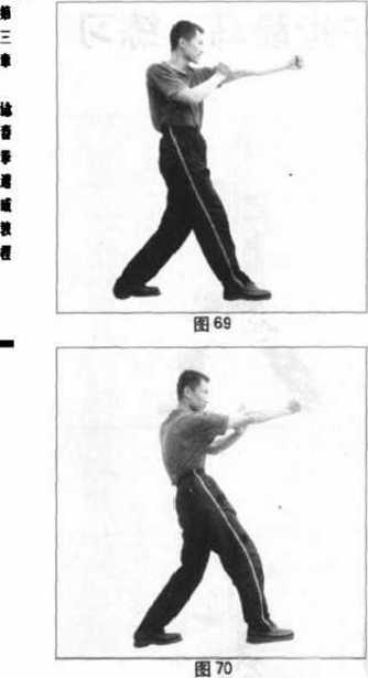 在讲解步箭马的动作要领和练法之前在这里首先澄清一件事那就是咏春拳并非有手无脚因为大多数外人对像春拳的真正理解太少仅仅限于其凌厉、凶狠的如机枪般快速连击的拳法上(图67、68、69、70),而对其独特而实用的步法却知之甚少这一方面是拳法的锋头盖过了其脚法另一方面是由于历代咏春拳前辈太保守所至也就是很多咏春拳先辈都极少讲及步法而只向一些嫡传弟秘传此等法度。当然即使偶有透露,也仅仅是一鳞半爪很难知道咏春拳1、一盘功夫的精奥之处。也难怪古时候武人就健此拳艺吃饭不轻易教绝招也在情理之中。如今社会开明且欲将国术推向全球以让外国人认识中华民族传统文化的博大精深所以再将绝学压在箱底已不合时宜。