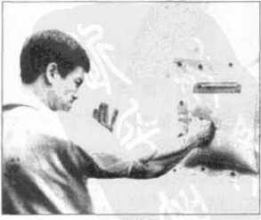 留课目而需要你去天天练习(至少每天应练儿下或隔去练一定的时间与强度),因为它对培养你的打击之破坏力与拳面硬度相当有用。更有一些味春拳高手会每天带若一块铁板以便有时间时便拿出来打几下(图127、128),正所谓曲不离口拳不离手一旦你的拳面适应铁板或铁沙的硬度(这种练法在少林拳法中叫铁拳功)那么你的拳头之攻击力与摧毁力将是极为惊人的。正因为如此一些咏春拳高手才不到万不得已不会出手以免误伤他人。