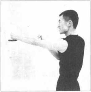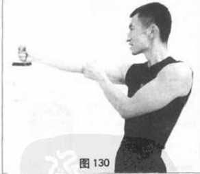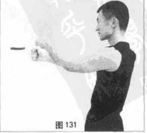 进行墙壁拳击袋训练时可以进行单拳打击以求养成正确的动力定型亦可双拳左右连击以便练习连环快攻的快速抢攻或迅速转入反击的能力。而且在你的双手前后进行交换时仍需使后拳从前手的腕部上侧打出(图129、130、131、132、133),以便占据兵家必争