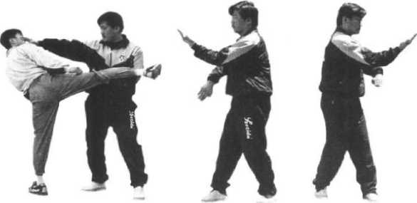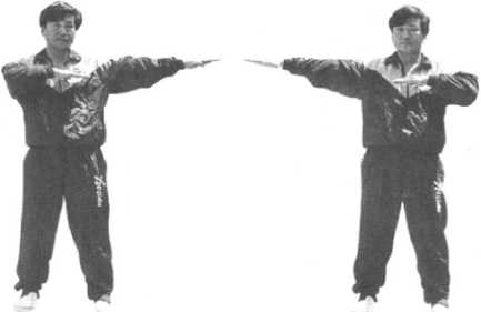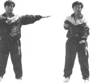 依上势以身腰马促劲身向右转左右拳化掌右掌以右肩、肘、腕劲下插成拦手左掌以肘、腕劲摊出成耕手104
