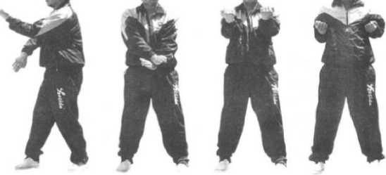 依上势用肘底劲缓缓收回至将台成豹拳(见图361)3