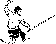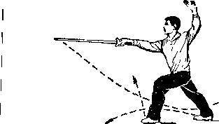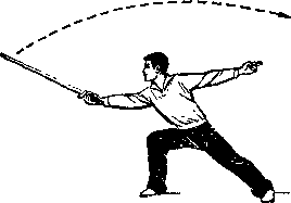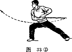 2上动不停右手持剑由后向前上方斜面弧形上削手心斜向上方手腕稍向掌心一侧弯屈事同时左手剑指伸向后方拇指一恻在上目视剑尖(图33之2)口