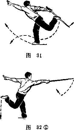 1右脚蹬地左脚向前跃步上身随之向右后转左脚落地脚尖稍外撇右腿摆向身后在上身转动的同时布臂外旋使拇指一例朝上}左手剑指在身后平伸手心朝下目视剑尖(图32之1)