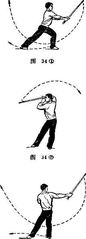 2以右脚跟为轴碾地手脚尖外獭上身向右后转?左脚随之向前上步以前脚掌虚着地面。同时右手持剑反手向下}向前七向上维续划弧撩起剑至前上方时酎部胳周拇指一侧在下剑尖高与肩平『左手副指随右手动作仍附于右手腕上目视剑尖(图34之2