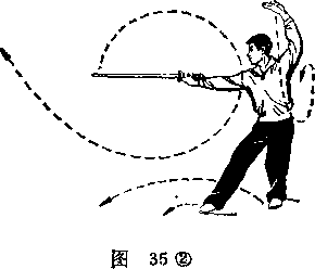 1右手持剑直臂向上、向右后方划弧左手剑指随势收于右肩前手心朝左。目视剑尖(图35之1