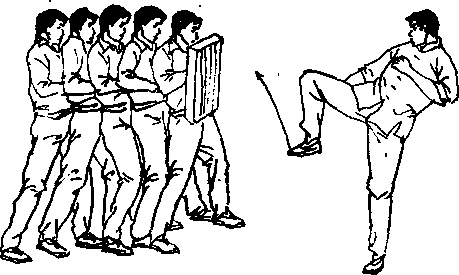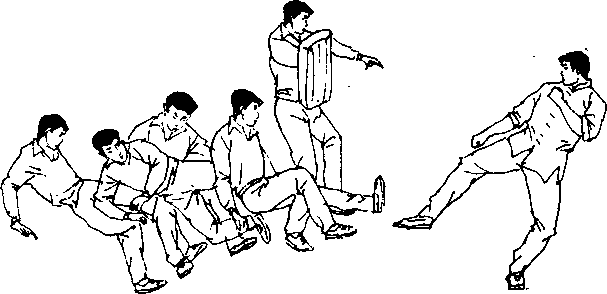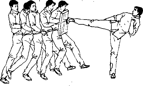验前面的训练水平,以及更好地发展攻击的纵深力与破坏性,练习时可让5名学员成纵队排成一列站稳最前面一名抱一沙包以保护自己和用以减缓踢击者的腿力(图30)