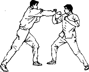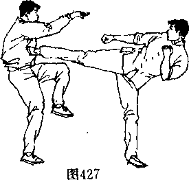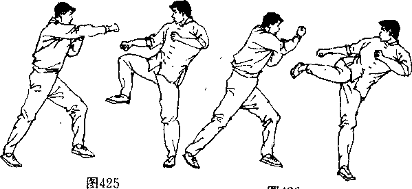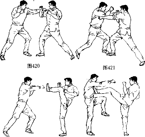 厘米使重心移至前脚出左拳重创对手胸面部(图421),抬起左脚(图422),用正踹腿猛击对手中盘(图423)。