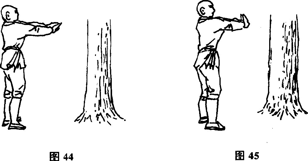 右,功力深者可适当远一些)两脚自然分开略宽于肩两膝微屈。双目平视脊背直立全身放松两臂由下向上抬起前伸虚腋两臂微屈由两手指尖与花草树木相对(图44)。
