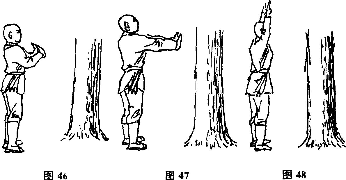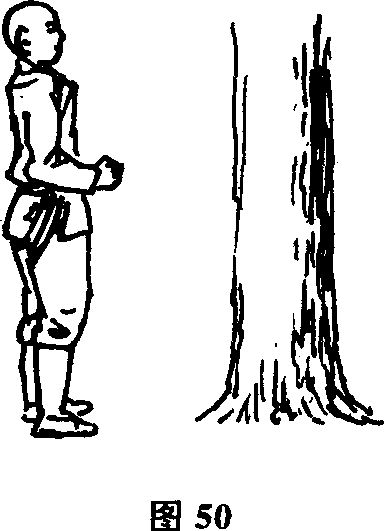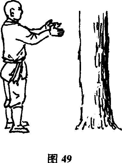 上缓缓抬起前伸掌心相对两膝微屈双目平视脊背直立全身放松(人与花草树木的距离约一米左右功力深者可适当远些)(图49)