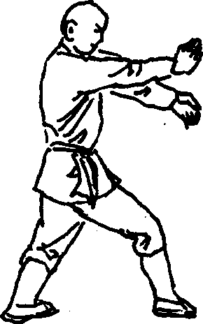 然后双掌分别慢慢向前推出并伴随呼气动作。左脚向后退一步成右弓步。重复上述动作(图95)。