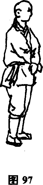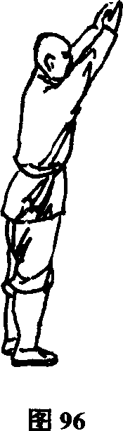 收势双掌相互重迭掌心斜向上左掌在上右掌在下(图96)。