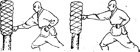 练功者以弓步站立面对棉桩矿间距一尺。先运气下沉丹田然后出左拳向前击竹桶桩
