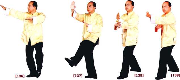 137-139左脚继续朝左前方45°迈进落地成右坐马步右掌上举自正前方向下按做按手左肘归中令左掌在右按手同时以横掌击出右按手置于左肘底下。