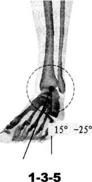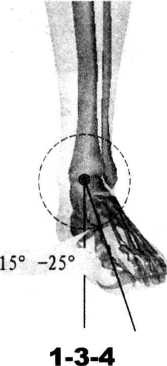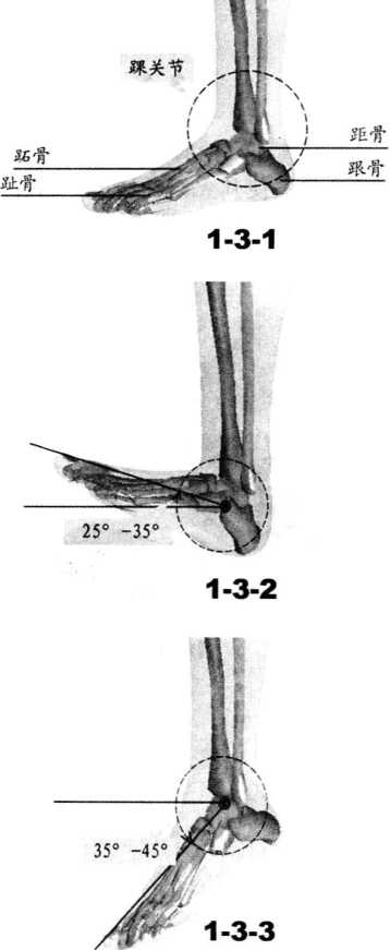 踝关节属滑车关节可在矢状面内绕冠状轴做背屈及跖屈运动。足尖向上背屈的角度25-35度角(图1-3-2)反之足尖向下跖屈角度35-45度角(图1-3-3)。在跖屈时