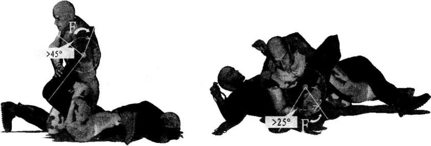 地面缠斗中的脚踝锁技术就是利用踝关节跖屈幅度有限这一生理特点施展技术动作迫使其大幅度伸展超过关节活动的临界点而产生剧痛和创伤的(图1-3-6)。脚趾固技术则是利用其侧向活动范围极为有限的特性施展技术动作迫使踝关节过度内收受到超生理限度的压迫而产生剧痛和创伤(图1-3-7)