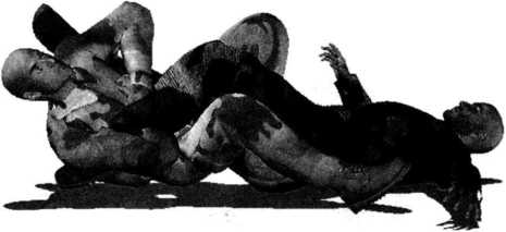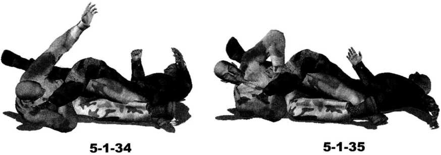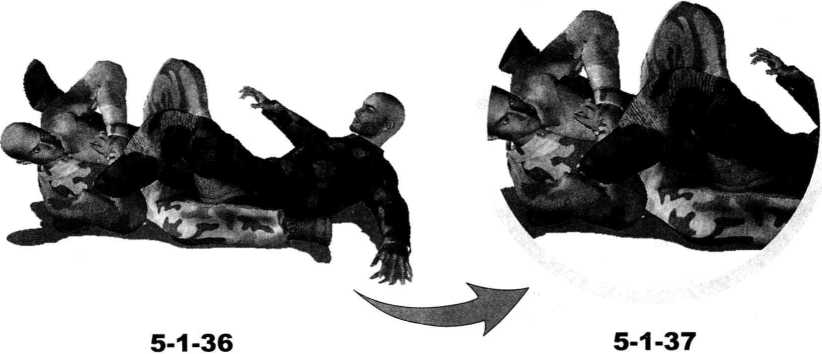 5- 1-43)。周身协调动作通过自身的前滚翻破坏对手身体重心的平稳瞬间可以将对方掀翻在地。在对方臀部着地的霎那右手顺势搂抓住对方右脚脚踝部位将其右腿控制于我两腿间。继而身体向右侧转动右侧腰胯与臀部着地左臂随之抬起展开腋窝同时右手用力向左侧腋下推撑对方右脚(图5-1-44)。随即左臂屈肘夹紧以左大臂后侧及肩胛骨后部为力点抵住对手右脚脚后跟和脚踝部位紧接着身体猛然向左翻转左臂用力向左后方别压对方右脚。同时甑关节前挺臀部坐