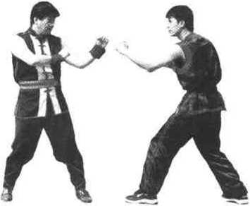 双方对峙准备格斗(见图25)甲方以右冲拳打乙方中上路乙方即以右摊手接甲方打来的拳。然后摊手突然转拉手身体同时右转打出左偏身拳(见图26)。
