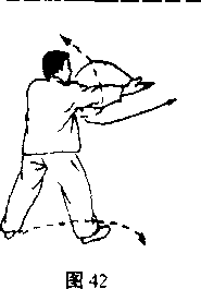 右脚前落脚尖内扣,上体微左转同时两拳变掌右伸,右掌心向匕左掌心向(图42)