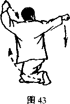 卜一动爪停左脚提起经右腿向后右排步两腿屈膝下蹲成歇步(或坐盘力同时,两掌向上、向左、向下、向右撰动当摆生侧时两掌变拳左拳继续向上向左架拳拳心斜向外,右拳内旋配臂向右冲拳拳心向目视右侧方(图43)