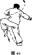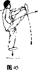 动不停脚蹬地起跳腾空里合摆腿同时1二体左后转体36()度匕拳变掌拦击右脚掌右拳屈肘收抱于腰间(图45)
