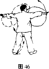 左、向身后摆掌屈腕成勾手勾尖向上目视左侧方。(图47)