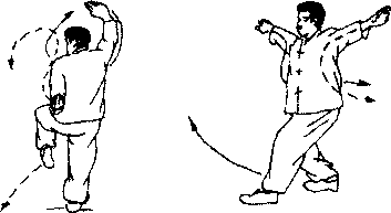上动不停左腿上抬右手向上、向左向向右向上摆掌成横掌架于头上方左掌向下向右、向上经右臂里侧向