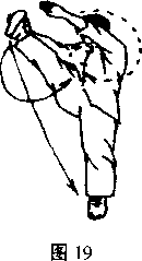 上动不停右腿向左经面前向右成扇面摆踢两手在额前依次拍击脚面口(图19)