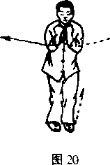右腿摆后先屈膝收腿然后向下震脚同时,两掌变拳里合拳心向里拳轮相对口(图20)